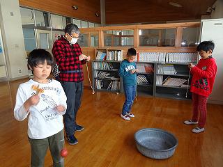 昔遊び ベーゴマです。佐々木先生が教えています。 剣玉もがんばっています。