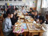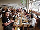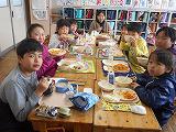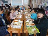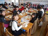 以前の活動記録です。食堂と教室を使って、なかよし班ごとに給食を食べながら交流しました。献立は「ミートスパゲッティ、牛乳、チョコグラ、ブロッコリー、プリン」、子どもたちは満足顔でした。