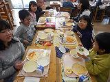 以前の活動記録です。食堂と教室を使って、なかよし班ごとに給食を食べながら交流しました。献立は「ミートスパゲッティ、牛乳、チョコグラ、ブロッコリー、プリン」、子どもたちは満足顔でした。