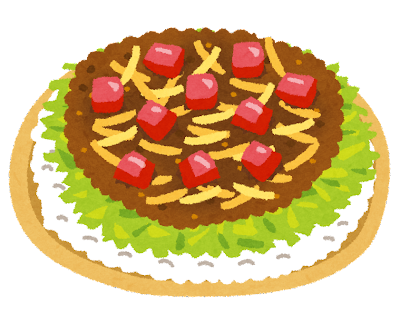 「タコライス」は1980年代に沖縄で誕生した料理です。それを給食用にアレンジしています。メキシコ料理の「タコ(タコス)」+「ライス」言う名前の通り、ご飯の上にタコスの具材を乗せて食べる料理です。なので、正解はご飯、キャベツ、タコミート、の順番で乗せると本場のタコライスに近い盛り付けになります。