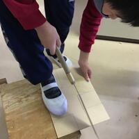 図工室から何やら音が・・・中では、4年生が木工の真っ最中でした。のこぎりで板を切っていますね。少々あぶなっかしい様子もありつつ、一生懸命に取り組んで見る間に上達しています。