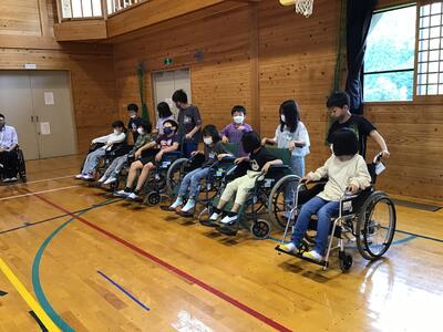 まずは、車椅子を使う側、補助する側に分かれて体育館に作った模擬コースを一周すると、両方の立場で様々な気付きがありました。「小さな段差も大きく揺れて怖い。」「車椅子を押すのって大変。」「段差を越えられない。」などなど。