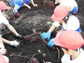 1年生がおいもほりをしました。一生懸命ほりました。保護者の方が春先丁寧に耕してくださったおかげで、すいか、サツマイモ、そして大根も育っています。いもほりは普段なかなか体験できないことですのでみんな大喜びでした。
