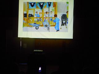 まずは、「夢は牛のお医者さん」の読み聞かせです。山あいにある小さな小学校に入学してきた3頭の子牛とひとりの少女のお話でした。