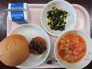 献立は「丸パン、牛乳、メンチカツ、ほうれん草とコーンのあえもの、ミネストローネ」です。丸パンにメンチカツをはさんで、ガブリ。今週始めは欠席が多かった1年1組も、子どもたちが元気になって登校してきました。来週からは、グループで食べられますよ、と担任の先生から話がありました。
