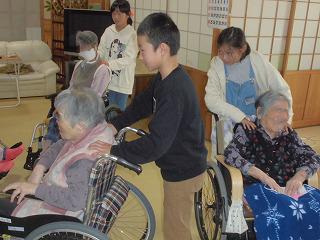 6年1組の子どもたちが訪問しました。事前に、介護や支援の在り方について学習したので、肩をもんだりガラス拭きをしたりしたグループもありました。