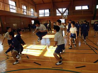 1年生にとって、初めて参加するなわとび集会でした。続けて跳べるように、体育の授業や昼休みなどに練習をしてきました。縄を回すのは先生方で、回る縄を見ながらタイミングよく跳んでいました。よくがんばりました。