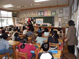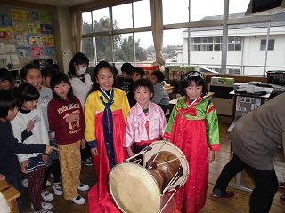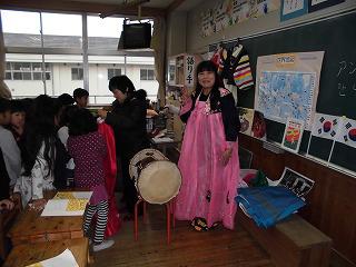 国語の「三年とうげ」の学習に合わせ、韓国の方に来ていただきました。韓国の文化や伝統、日本との習慣の違いなどについてお話をいただいたり、三年とうげの群読に合わせて、太鼓をたたいたりしてくださいました。また、実際に韓国の遊びを体験したり、民族衣装を着せてもらったりして、子どもたちは大はしゃぎ(先生も大はしゃぎ)でした。貴重な体験をありがとうございました。