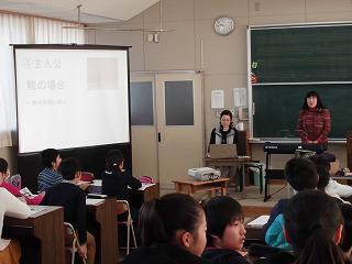 狂言「柿山伏」の学習に合わせて、原田寛子氏を講師にお招きし、能や狂言について学習しました。能や狂言の起こりや歴史、能面や舞台に関することなど、初めて耳にすることが多く、子どもたちは興味津々に聞き入っていました。実際に「オモテ」(能面のことを言います)を付けて舞ってみたり、鼓をうったり、貴重な体験ができました。大変ありがとうございました。