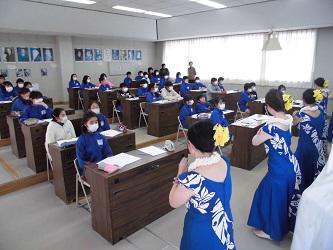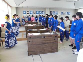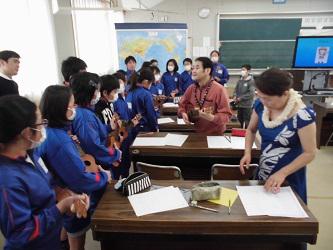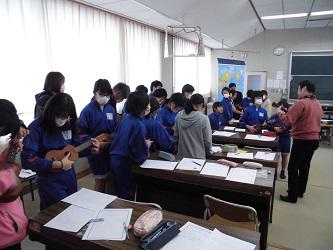 10日(金)国際理解教育支援ボランティアのみなさんのご協力により、6年生の世界の音楽VT授業が行われました。当日はフラダンス8名ウクレレ1名の愛好会の皆様においで頂き、フラダンスの歴史と踊り、ウクレレの演奏指導を受けました。テレビなどで見たことのあるフラダンスを実際に教えて頂き、6年生も楽しそうに踊っていました。また、実際に練習用のウクレレをお借りて演奏しました。ハッピバースデーツーユーを演奏しました。歌に合わせて音を鳴らすと、なんとなくそれらしく聞こえてきました。楽しい1時間でした。
