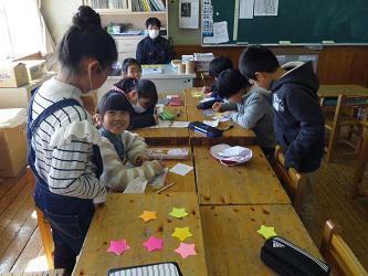 本校では1年生から6年生までが縦割りで10名程度の班を作り、清掃や休み時間の遊び、集会活動での班活動等を行っています。6年生が下級生の面倒をよくみて活動をしています。1年生は6年生を見つけると「班長、一緒に遊ぼう。」等と声をかけ、6年生も1年生と一緒に遊んでいます。もうすぐ卒業式を迎えるこの時期、「6年生を送る会」でのプレゼントとして色紙作りを行います。一緒に撮った写真を真ん中に、班のメンバーが6年生に向けてメッセージを書き込んでいきます。それぞれの班ごとに分かれ、下級生はお世話になった6年生への思いを言葉にしていきます。42枚の色紙ができあがるのももう少しだと思います。今年はどんな色紙が完成するのか楽しみです。