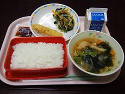 今日から、給食が始まりました。1学期の最初の給食は、セルフイカ天どん、和風あえ、みそ汁、牛乳でした。衣がサクサクのイカ天にあったかみそ汁で、子どもたちもおいしくいただきました。