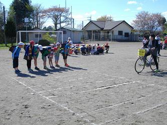 交通安全教室が行われました。横断の仕方を中心にした練習です。「横断用意! 右 左 右 横断!」 班長の号令に合わせ、一人一人が自分の目で左右を確認し、しっかりと手を挙げて横断します。校庭に模擬道路を作り、自転車が走る中、ランドセルを背負っての本番さながらの練習です。というのは、1年生のお迎え下校が終わり、この日からお兄さん、お姉さんたちとの下校になるのです。さあ、1年生、安全に注意して頑張って歩きましょう!