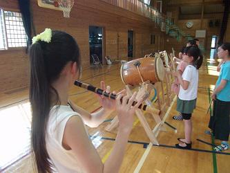 本校の特色ある教育活動の1つとして、地域に残る伝統芸能の伝承を取り入れています。今年も、会長の山崎長治様をはじめ、「平戸流上深津お囃子保存会」の皆様に御協力いただき、太鼓や笛の演奏に励んでいます。この保存会は、江戸時代後期に、江戸で平戸流の免許を受けた佐藤新弥に指導を受けて以来、地囃子と共に平戸流五段囃子を受け継いでいる団体です。練習の成果は、7月に行われる育成会主催の盆踊りと9月の運動会で披露されます。ぜひ、御覧いただきたいと思います。