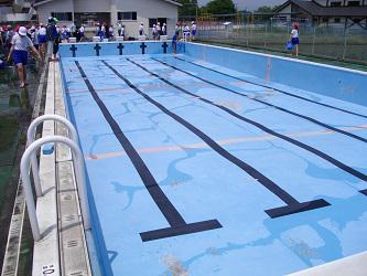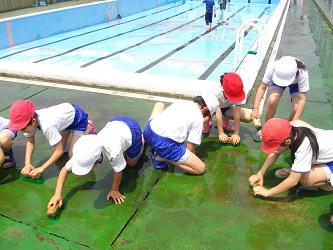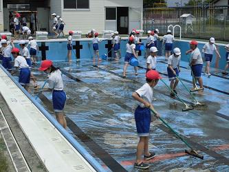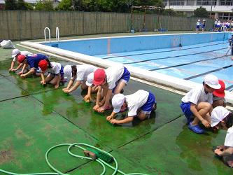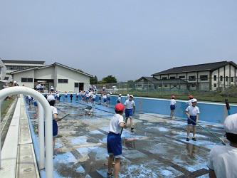 5、6年生によるプール清掃が行われました。1年間の汚れを取るのは大変でしたが、晴天のもと、冷たい水に気持ちよさを感じながらの作業でした。