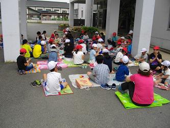 外でみんなで食べると、さらにおいしくなるから不思議です。笑顔いっぱいの野外給食でした。