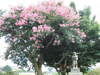 池の向こうの 二宮金次郎さんの隣りのサルスベリも立派です