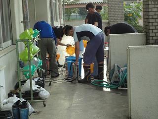 2年ぶりの池の掃除です。開始前に池に落ちた人もいます。 引き上げた地下水を必死で押さえます。
