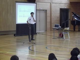 子どもたちは、校長先生が武子川の上流を探検したお話を、興味津々に聞き入っていました。(ちなみに、昨年は男体山に登頂した様子をお話してくださいました。)途中、イノシシやマムシも出てくるような所を、果敢に突き進んだそうです。