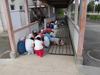今日は、予告なしでの竜巻の避難訓練が行われました。竜巻接近の緊急放送を聞いたときに、自分の判断で自分の身を守る対応行動を習得するための訓練です。昨日の事前学習を生かし、多くの子どもたちは、その場に応じた適切な対応行動をとれていたようです。