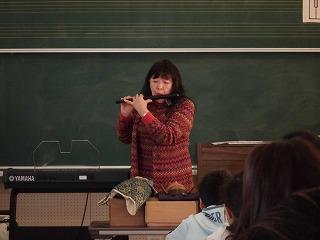 狂言「柿山伏」の学習に合わせて、原田寛子氏を講師にお招きし、能や狂言について学習しました。能や狂言の起こりや歴史、能面や舞台に関することなど、初めて耳にすることが多く、子どもたちは興味津々に聞き入っていました。実際に「オモテ」(能面のことを言います)を付けて舞ってみたり、鼓をうったり、貴重な体験ができました。大変ありがとうございました。