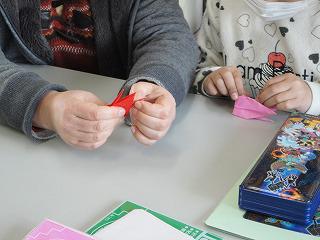 村上先生 折り紙です。あっという間に鶴を完成させました。