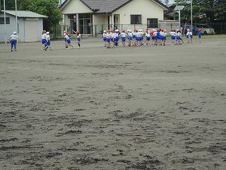 ソフトボール投げ 体育館屋根の上の大空に向かって、山なりに投げること。