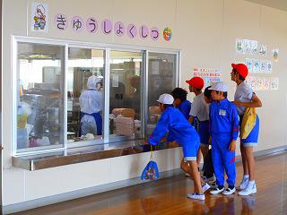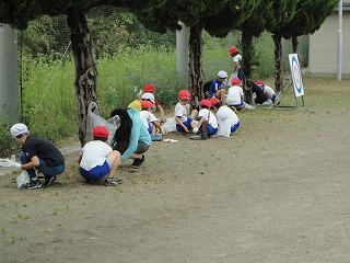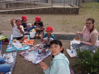 今日は野外給食です。「仲よし班」ごとに校舎の外で給食を食べます。「仲よし班」は9~10人の縦割り班で、1~6年生が1年間を通じて一緒に掃除をしたり、遊んだりします。6年生を中心に仲良く会食をして、ごみは協力してまとめて片付けました。