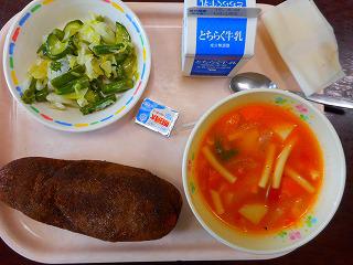 2校時が終わりましたが、お腹が空きました。献立は、ココア揚げパン、牛乳、アスパラ入りサラダ、ミネストローフでした。