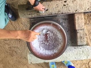 熱い中でしたが、子供たちは塩づくりに取り組みました。海水を汲んで、大きな釜で煮詰め、蒸発させた後にはミネラルたっぷりの塩が残ります。つくった塩はおみやげです。