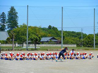 ソフトボール投げ 体育館屋根の上の大空に向かって、山なりに投げること。