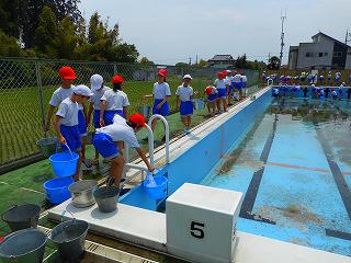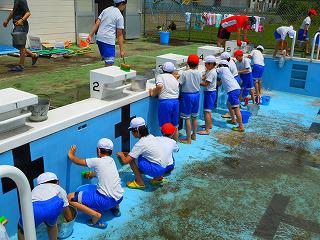 水泳の授業に備えて、子どもたちがプール清掃を行いました。まず、4年生がプールサイドの除草、更衣室やシャワーを掃除しました。続いて、5・6年生がプールサイドやプールの中をバケツで水を何回も運び、先生の指示で間隔をあけないように一列に並んでデッキブラシ等で汚れを落としました。おかげで、こんなにきれいになりました。ご苦労さまでした。