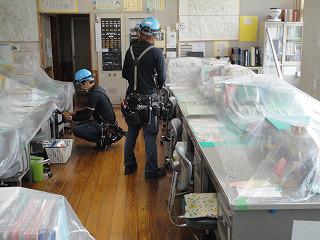 寸暇を惜しんで業者の皆さんがエアコン工事を進めています。暑い中黙々と作業する姿は仕事に取り組む姿勢を教えてくれます。2学期わたしたちも真摯に何事にも対応していこうと考えました。職員室内も物品を気遣って丁寧にシートを敷いてくれました。