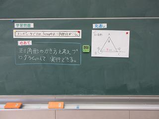 5年生で算数の研究授業がありました。これから必要とされる「プログラミング教育」の内容を踏まえ実施しました。じっくり正三角形の作図について考えさせ、命令を与え三角形を完成させる学習です。これからの社会を拓く子どもたちはこうした学習が大切なんですね。