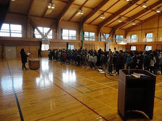 「友だちはいいもんだ」を全校生で歌いました。寒い体育館でしたが寒さを吹き飛ばす元気な歌声と友だちを思いやる歌詞の内容に心を打たれました。