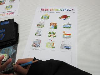 子どもたちに身近な税金は、買い物のレシートに印字されている消費税です。しかし、そのことを知らない子どもたちもいて、できれば消費税がない方が安くてすむのでいいなあという気持ちで授業が始まりました。DVD「マリンとヤマト 不思議な日曜日」をとおして、税金のない社会で交番で道を尋ねるのにも料金がかかったり、壊れた橋がそのまま放置されたりする社会になってしまう現実を突きつけられました。その後、税金でつくられている建物についてグループで話し合いながら、税金の必要性について考えました。