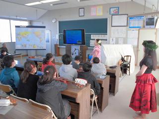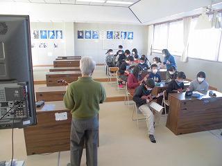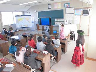 6年生音楽で、フラグループ「カレイナニ(美しいレイ)」の方々を指導者に招いて外国の伝統文化に触れ、他国の文化を理解する学習を行いました。ウクレレも実際に奏でることもできみんな興味深く聞き入っていました。