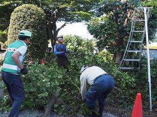 一方、校門の脇の植え込みでは同じく地域の方がチェンソーで植木の剪定までしてくださいました。1時間足らずで見違えるようにきれいになりました!ありがとうございました。