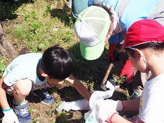学年ごとに分担された箇所に行き、長寿会・シニア会の方たちに教えていただきながらみんなで草むしりをしました。
