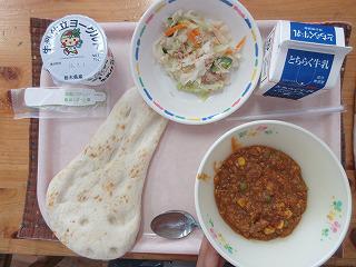 今日は、4~6年生が市民文化センターでの演劇鑑賞教室に出かけます。少し早めの給食「ナン、キーマカレー、ツナサラダ、ヨーグルト」を食べました。キーマとは細切り肉とかひき肉という意味ですが、とにかくカレーなので子どもたちは大喜び。ナンはご存知のとおり小麦粉をねったもので、それだけで食べると少し甘みを感じます。だから、ピリ辛のキーマカレーとベストマッチング。子どもたちは、ナンの上にカレーをのせたり、器の中にナンをちぎって入れたりして、思い思いに食べていました。