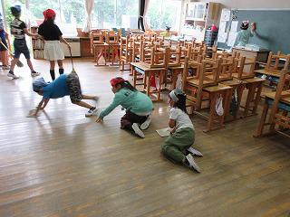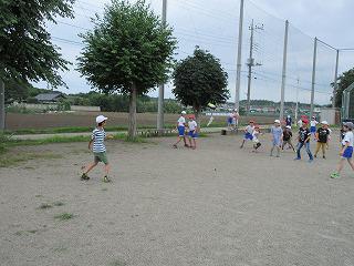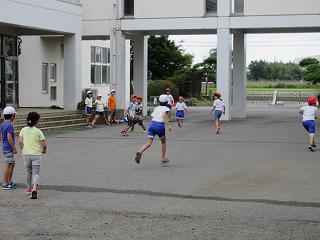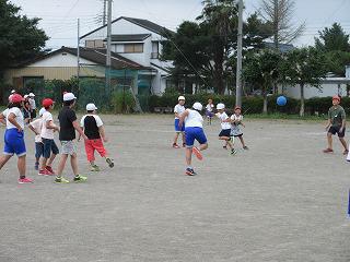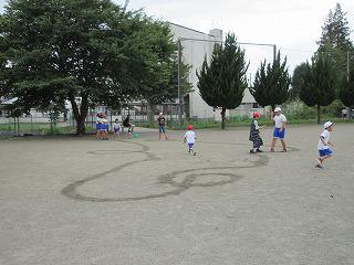 遊びは、三本線、ケイドロ、ヘビ鬼、ドッジボール、ドッジビー(ボールの代わりにフリスビー)。こういうときの一番人気は、ケイドロ。体育館の玄関やプールの入口を牢屋に見立てた鬼ごっこです。遊ぶのに何の道具もいらない。これが一番ですね。子どもたちは、これまでにも清掃で顔を合わせているので、1学期はじめのときよりもしっくりいっているようで、微笑ましく見守ることができています。