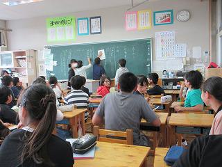 4年1組は音楽室を使っての授業でした。4文字の言葉「おまつり」を短く切って「おまつり(休み)おまつり(休み)」言葉を伸ばして「おーまーつーりー」などのリズムパターンをもとに、てリズムアンサンブルの楽しさを味わう授業でした。3、4人のグループに分かれて、教科書以外の4文字言葉を考えて(例:おんがく、しまねこ、など)練習し、発表しました。