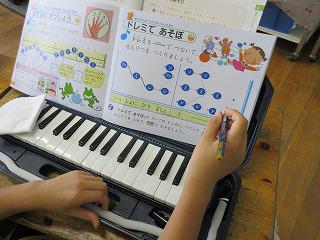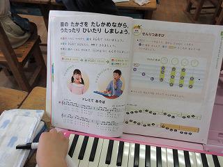 音楽の授業は、教科書に載っている曲を歌ったり演奏したりするだけでなく、曲想を感じながら楽しむという内容になっています。この日は、2年生が「ドレミであそぼ」という曲を歌ったり鍵盤ハーモニカで演奏したりした後、「ファ・ミ・レ」に続く音を、「レ・ファ・ソ」「ド・ミ・ソ」・・・から一つずつ鍵盤ハーモニカで試し吹きしながら選んでいました。最後に、自分で工夫した旋律をみんなで鑑賞し合いました。