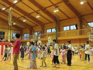 子供会育成会主催の盆踊り大会が体育館で開催されました。直前に突然の強い雨が降ってきましたが、今朝の段階で会場を変更してあったので難を逃れました。