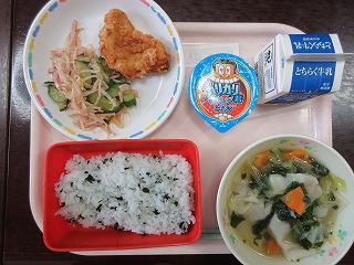 今日の給食は、5年生が考えたリクエスト献立です。メニューは、「わかめごはん、牛乳、からあげ、キムチあえ、ワンタンスープ、かき氷」です。暑い季節にぴったりのキムチあえと冷たいかき氷を食べたいという希望を取り入れ、このメニューになりました。食べる直前まで、給食室の冷蔵庫で冷やしてあったキンキンのかき氷を食べた子どもたちは、束の間の涼しさを味わいました。9月は、4年生のリクエスト献立です。お楽しみに!