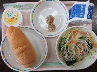 1学期最後の給食は、「減量ミルクパン、牛乳、冷やし中華、シュウマイ、レモンゼリー」です。蒸し暑い日なので、喉ごしのよい麺類は子どもたちにも好評でした。教室によっては、余ったゼリーをじゃんけん勝負で決めていました。