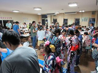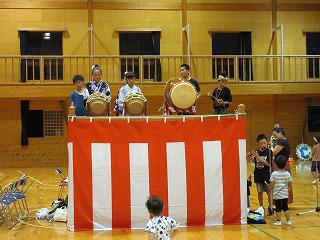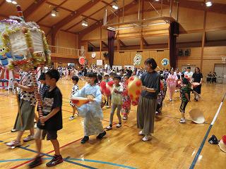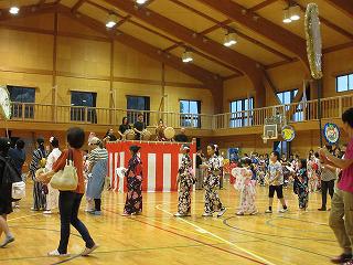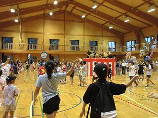 子供会育成会主催の盆踊り大会が体育館で開催されました。直前に突然の強い雨が降ってきましたが、今朝の段階で会場を変更してあったので難を逃れました。