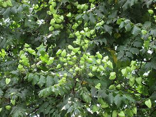 鹿沼市の天然記念物「津田小学校のモクゲンジ」は、黄色の花がほとんど落ちてしまい、実ができつつあります。緑色の袋の中で、少しずつ大きくなっているのだと思います。残念ながら、英名の金色の雨を見ることはできませんでしたが、秋になると緑色の袋が茶色になって黒色の実ができるでしょう。