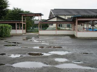 PTA奉仕作業の際、保護者の方から中庭や南校庭の凹凸について何とかならないかという相談がありました。雨が降り、そこに車が通ると溜まっていた水が動き、土を削り、穴が大きくなっていく。それが、至る所に、というのが現状です。以前、重機を入れて整地したこともあったようですが、車が入ればこの状態に逆戻りです。