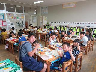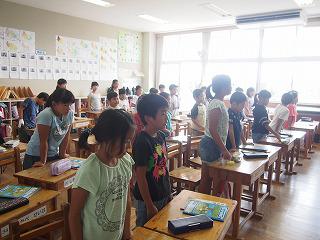子どもたちの登校と同時に、給食も昨日から始まりました。本日の献立は「まるパン、牛乳、ハムカツ、華風サラダ、ゼリー」です。パンやごはんの「きいろの食べ物」はエネルギーのもとになりますが、豚肉や大豆、ごま、卵、牛乳などのビタミンB1やB2を含む食べ物を食べないと夏バテの原因になるそうです。昨日、今日と涼しさが心地よく感じられますが、明日以降残暑という予想も出ていますので、食生活の面からも気をつけたいものです。